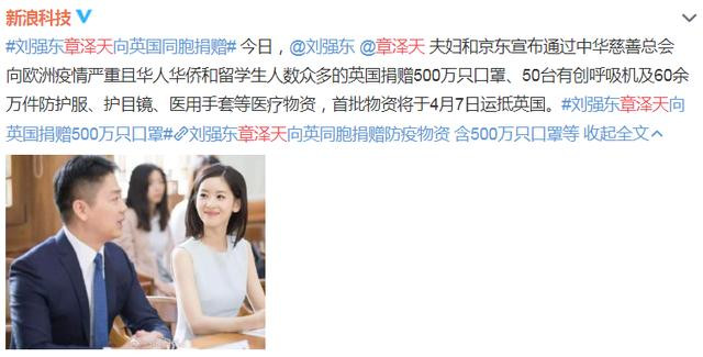 Vừa qua, tỷ phú Lưu Cường Đông (Liu Qiangdong) cùng vợ hot girl trà sữa Chương Trạch Thiên đã hợp tác cùng trang thương mại điện tử nổi tiếng Trung QUốc JD.com để quyên góp 5 triệu khẩu trang, 50 máy thở xâm lấn và hơn 600.000 vật tư y tế như quần áo bảo hộ, kính bảo hộ và các vật tư khác cho Vương quốc Anh thông qua Liên đoàn từ thiện Trung Quốc. Lô vật tư y tế đầu tiên đến Anh vào hôm nay 7/4.