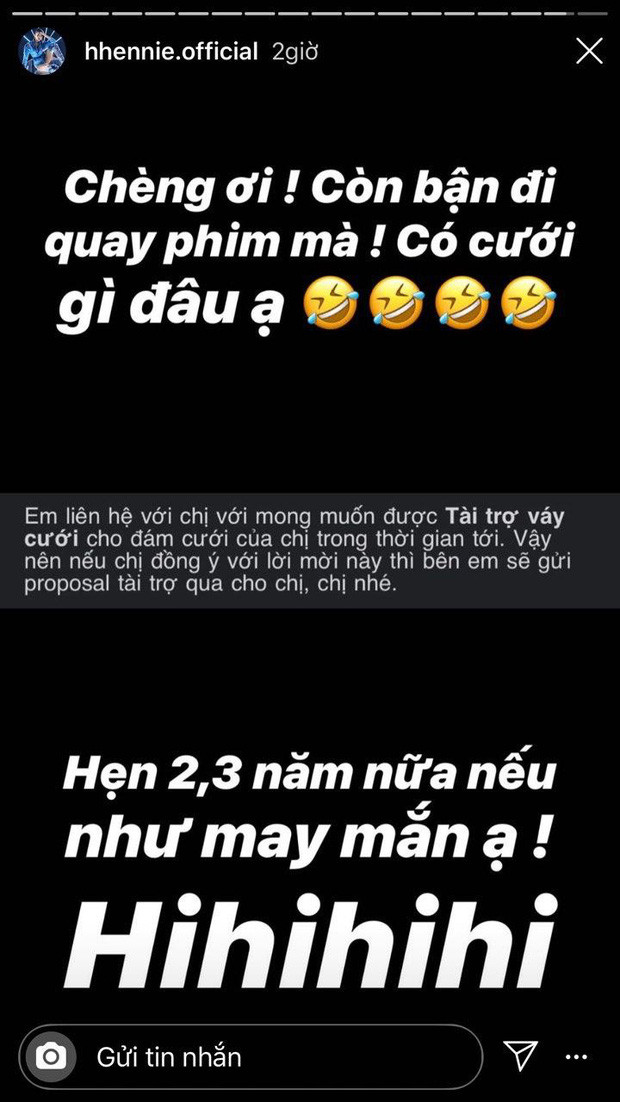 Có lẽ nghe phong phanh tin đồn H'Hen sắp lấy chồng nên nhãn hàng nào đó đã xin được tài trợ váy cưới. Cô hoa hậu cũng tiết lộ 2-3 năm nữa sẽ "xuất giá" nếu may mắn.