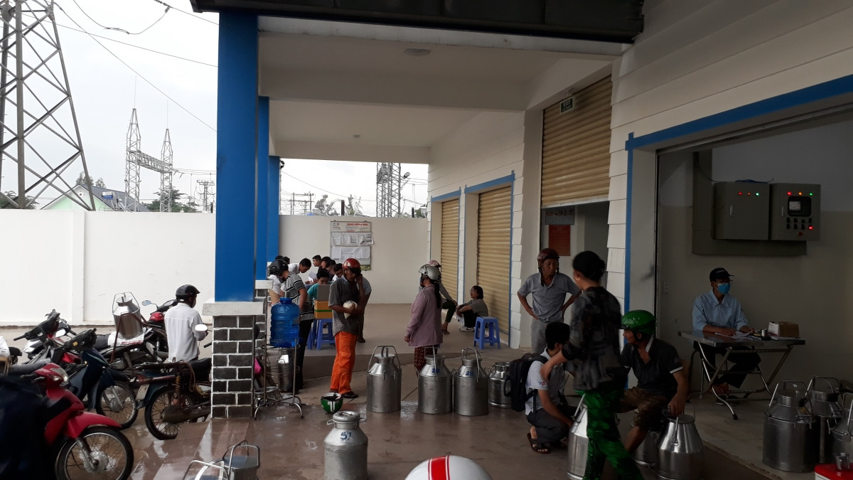 Nhóm sinh viên lấy ý kiến người dân tại Trạm trung chuyển sữa tươi nguyên liệu Ba Tri-Bến Tre. (Ảnh: Đoàn trường)