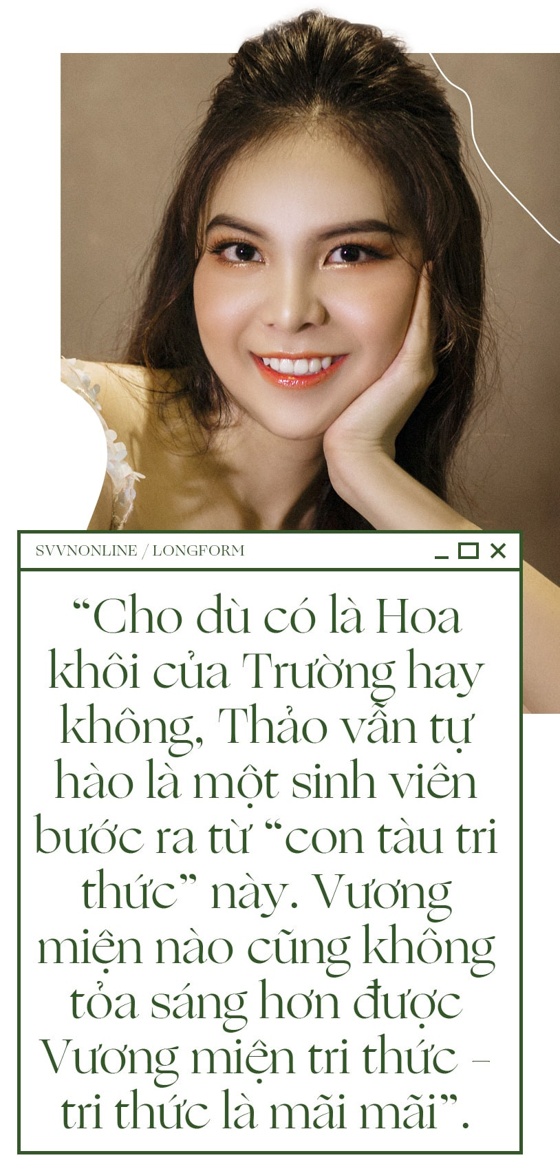 Sau cùng, Thảo muốn cảm ơn trường Đại học Quốc tế Hồng Bàng đã cho Thảo một thanh xuân thật dễ thương. Cho dù có là Hoa khôi của Trường hay không, Thảo vẫn tự hào là một sinh viên bước ra từ “con tàu tri thức” này. Vương miện nào cũng không tỏa sáng hơn được Vương miện tri thức – tri thức là mãi mãi. Thảo mong với những chia sẻ rất thật của mình giúp các bạn sinh viên có thể tự tin hơn, quyết đoán hơn trong những dự định tương lai sắp đến. Thanh xuân chỉ có một, nếu không rực rỡ thì cũng không được mờ nhạt. Hi vọng những người trẻ chúng ta cùng nhau tạo những năng lượng tích cực, đem nhiệt huyết của tuổi trẻ làm chủ tương lai, trở thành những con người có tài đức đóng góp cho xã hội.