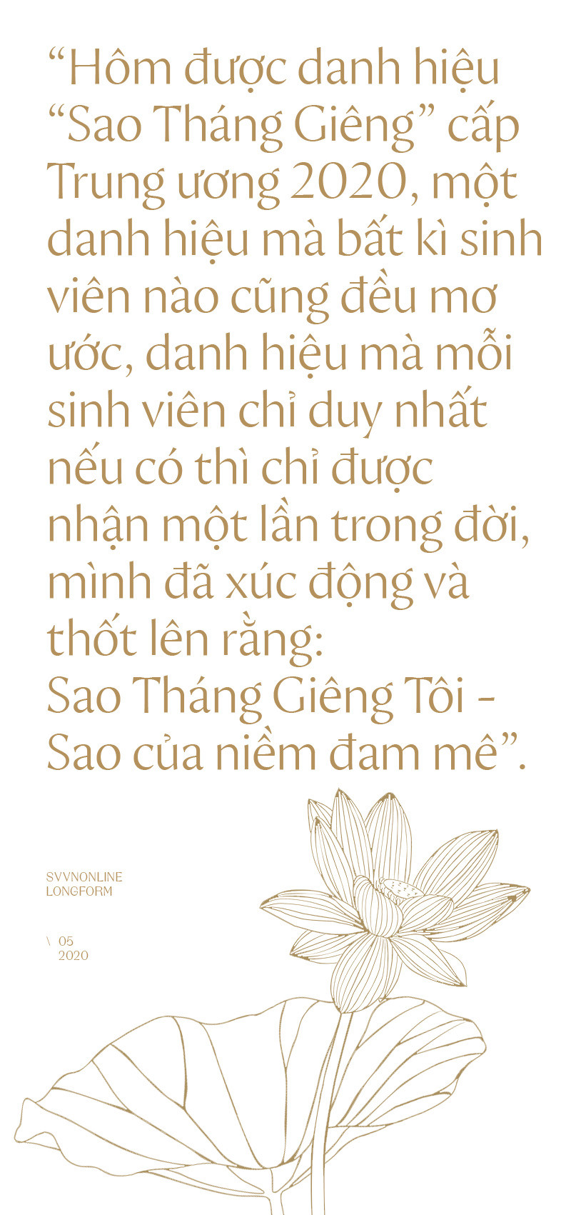 Hôm được danh hiệu “Sao Tháng Giêng” cấp Trung ương 2020, một danh hiệu mà bất kì sinh viên nào cũng đều mơ ước, danh hiệu mà mỗi sinh viên chỉ duy nhất nếu có thì chỉ được nhận một lần trong đời, mình đã xúc động và thốt lên rằng: Sao Tháng Giêng Tôi - Sao của niềm đam mê.
