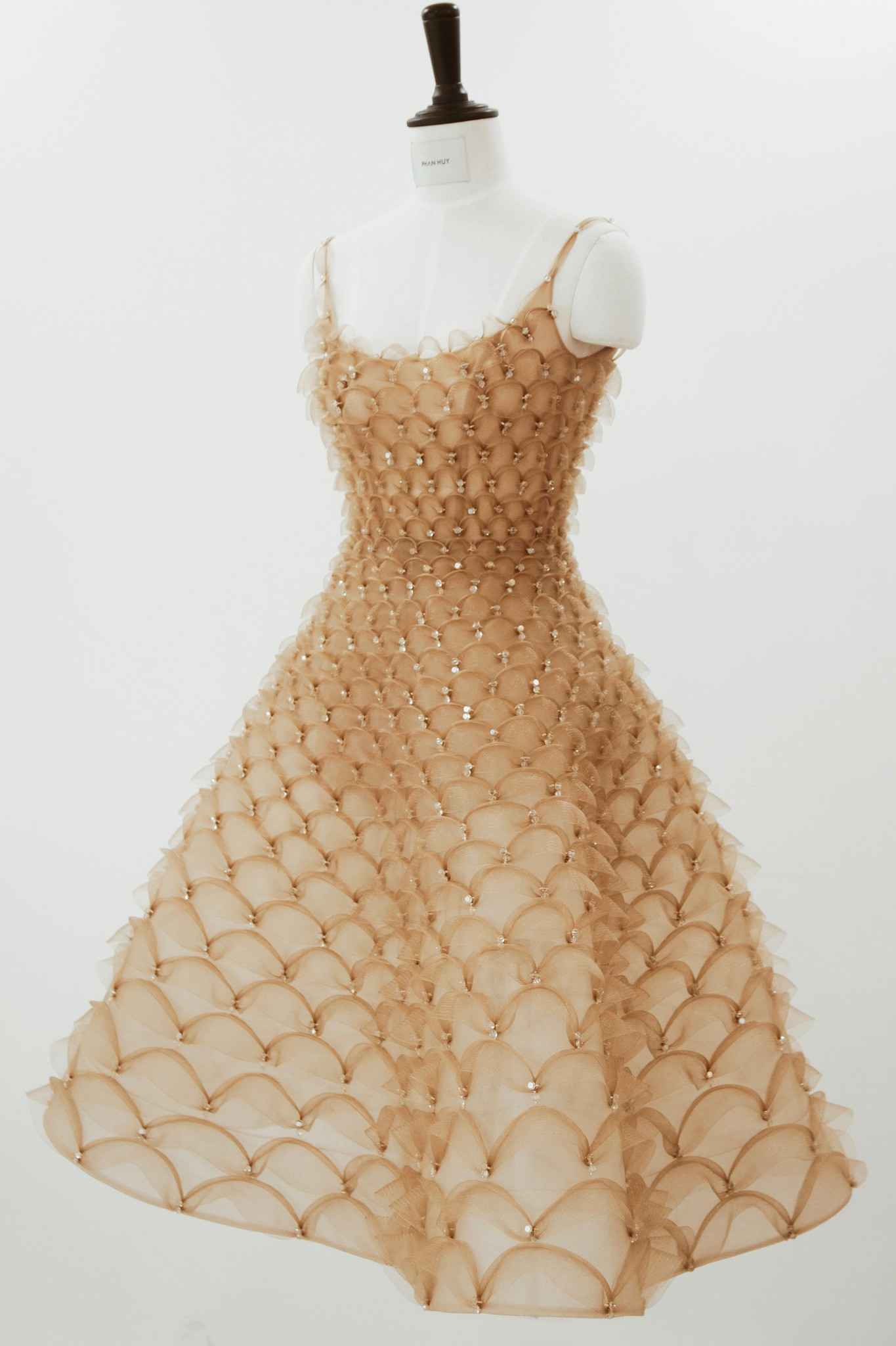 Trong các mẫu thiết kế được công bố, có một mẫu đầm đang nhận được sự quan tâm hơn cả. Đó là thiết kế váy màu nude bồng xòe lấy hình ảnh từ con sóng nước mùa lũ lăn tăn, sử dụng phương pháp tạo hình 3D cùng 820 viên đá pha lê 8 li được đính kết tỉ mỉ.