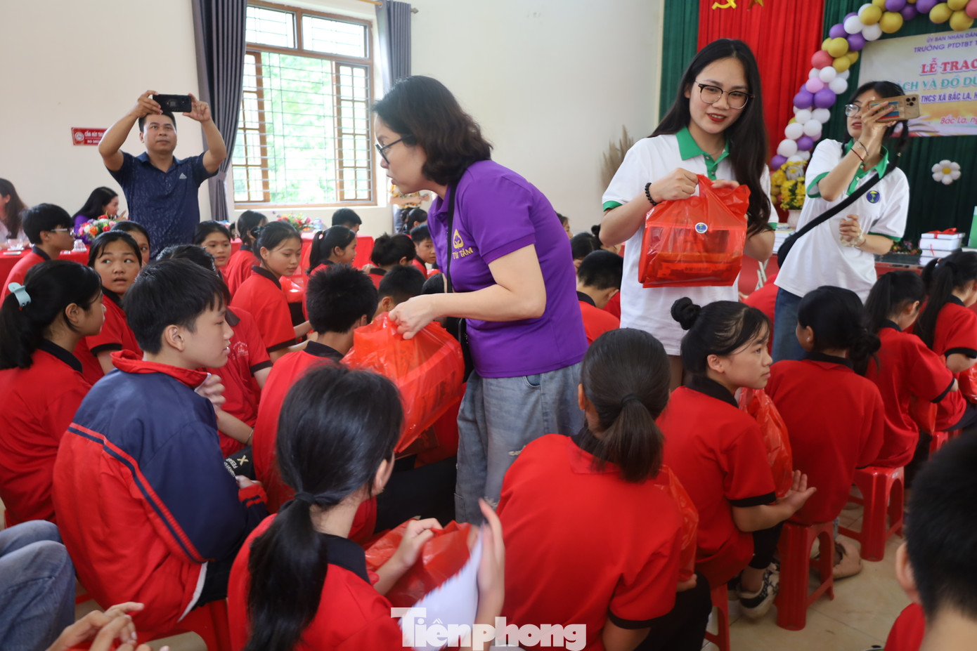 | Các em học sinh xứ Lạng phấn khởi nhận quà của các nhà hảo tâm. Ảnh: Duy Chiến |