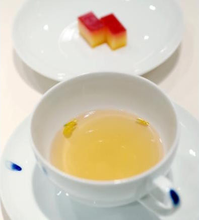 Một món tráng miệng khác trong thực đơn gồm 2 phần. Trà nấm thông có nguồn gốc từ núi Baekdudaegan, ở vùng cực Bắc Triều Tiên.