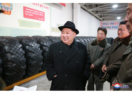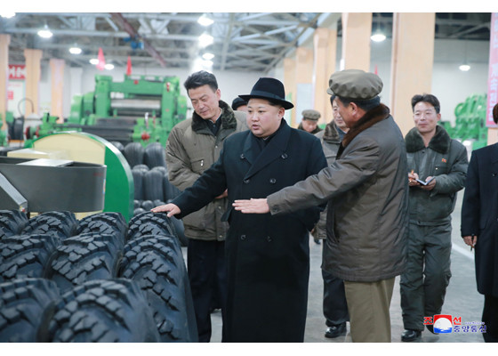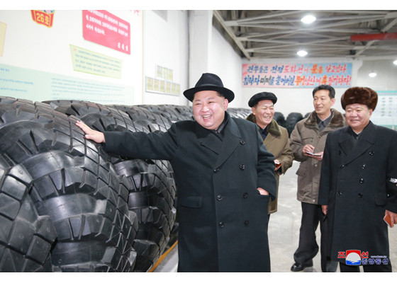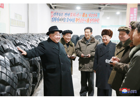 Phát biểu tại nhà máy, Chủ tịch Kim tỏ ra ấn tượng trước “tinh thần chiến đấu và phong thái làm việc của các cán bộ công nhân viên nhà máy”, những người đã “sản xuất ra các lốp xe cỡ lớn từ thiết bị trong nước với thời gian ngắn, mà không cần phụ thuộc vào thiết bị nhập khẩu”. Ảnh: Rodong Sinmun