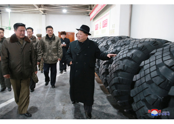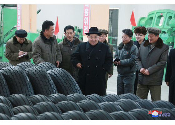 Chủ tịch Kim nhấn mạnh tầm quan trọng của việc sản xuất lốp cao su đối với nền kinh tế và quốc phòng, đồng thời giao nhiệm vụ cho các công nhân phải “sản xuất thành công lốp xe cỡ lớn cho xe mang phóng tự hành 9 trục”. Ảnh: Rodong Sinmun