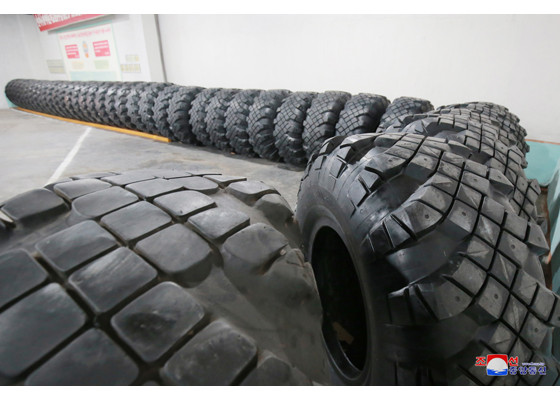 Nhà lãnh đạo Triều Tiên khen ngợi các công nhân vì đã cho ra đời các lốp xe kích thước lớn kiểu mới, vượt xa chất lượng của lốp xe nhập khẩu. Ảnh: Rodong Sinmun
