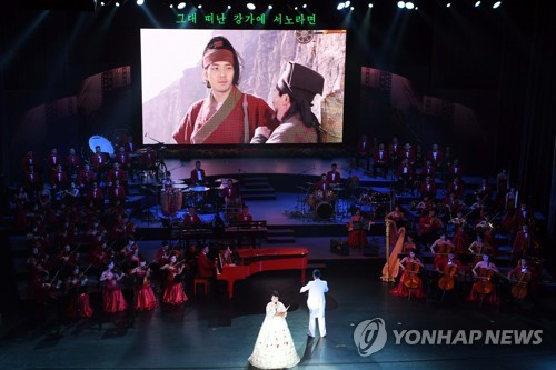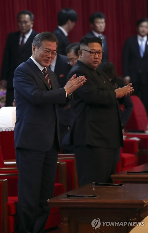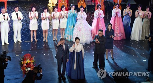 Tối cùng ngày, Tổng thống Moon ghé thăm Nhà hát lớn Bình Nhưỡng để cùng Chủ tịch Kim xem chương trình biểu diễn nghệ thuật của các nghệ sĩ nổi tiếng nhất nhì Triều Tiên.