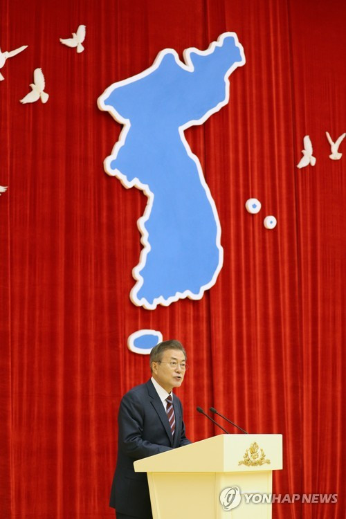 Phát biểu tại tiệc chiêu đãi, Tổng thống Moon cho biết: “Việc phi hạt nhân hoá hoàn toàn bán đảo Triều Tiên và thiết lập hoà bình là mục tiêu chính trong chương trình nghị sự.” Ảnh: Yonhap