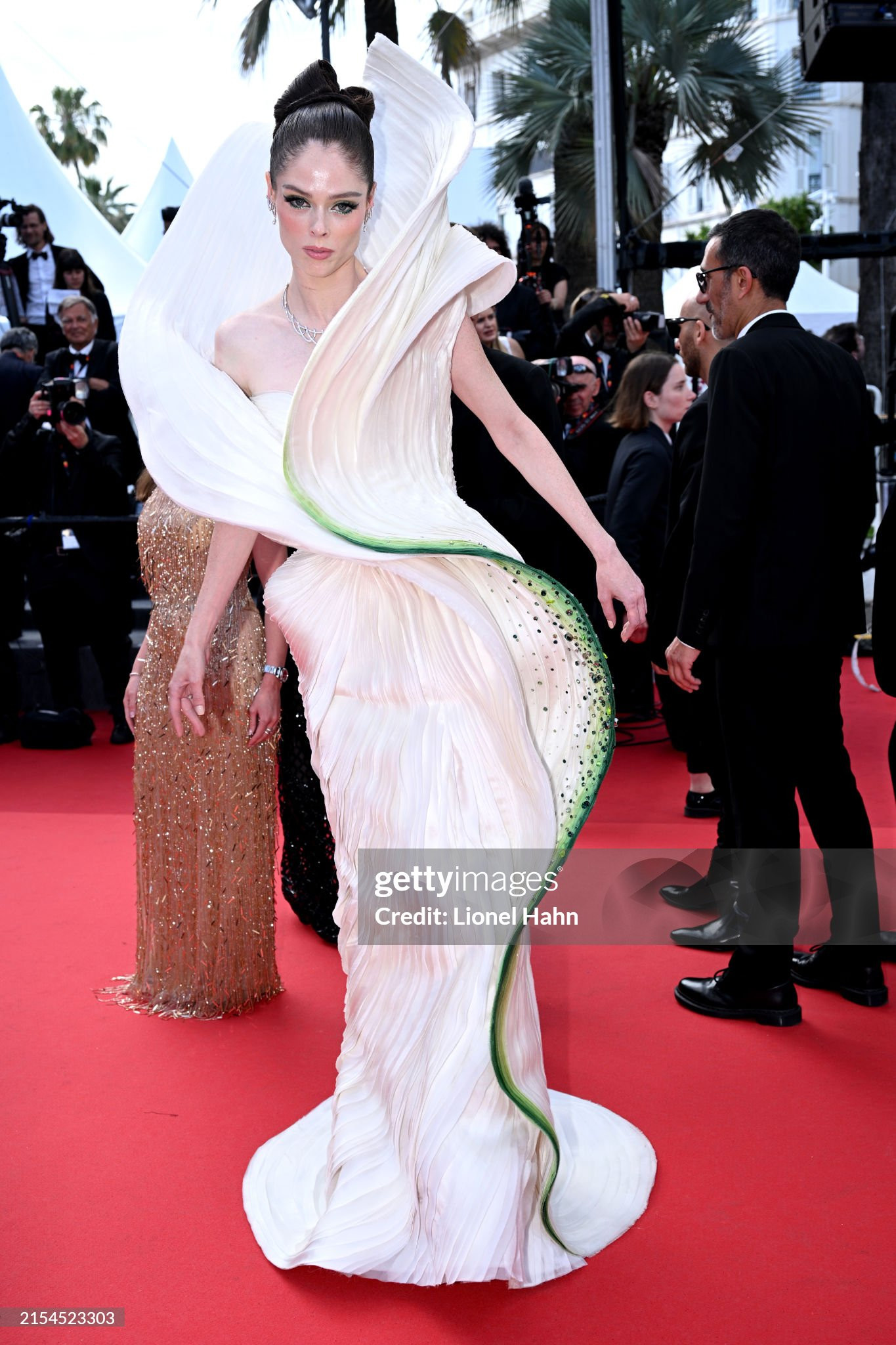 Siêu mẫu Coco Rocha tiếp tục khuấy đảo thảm đỏ Cannes trong ngày 11 với diện mạo không thể slay hơn. Siêu mẫu lăng xê mẫu đầm độc đáo của NTK Cheney Chan. Kiểu makeup nhấn vào đường kẻ mắt màu xanh trùng với đường viền trên váy "ghi điểm" mạnh mẽ.