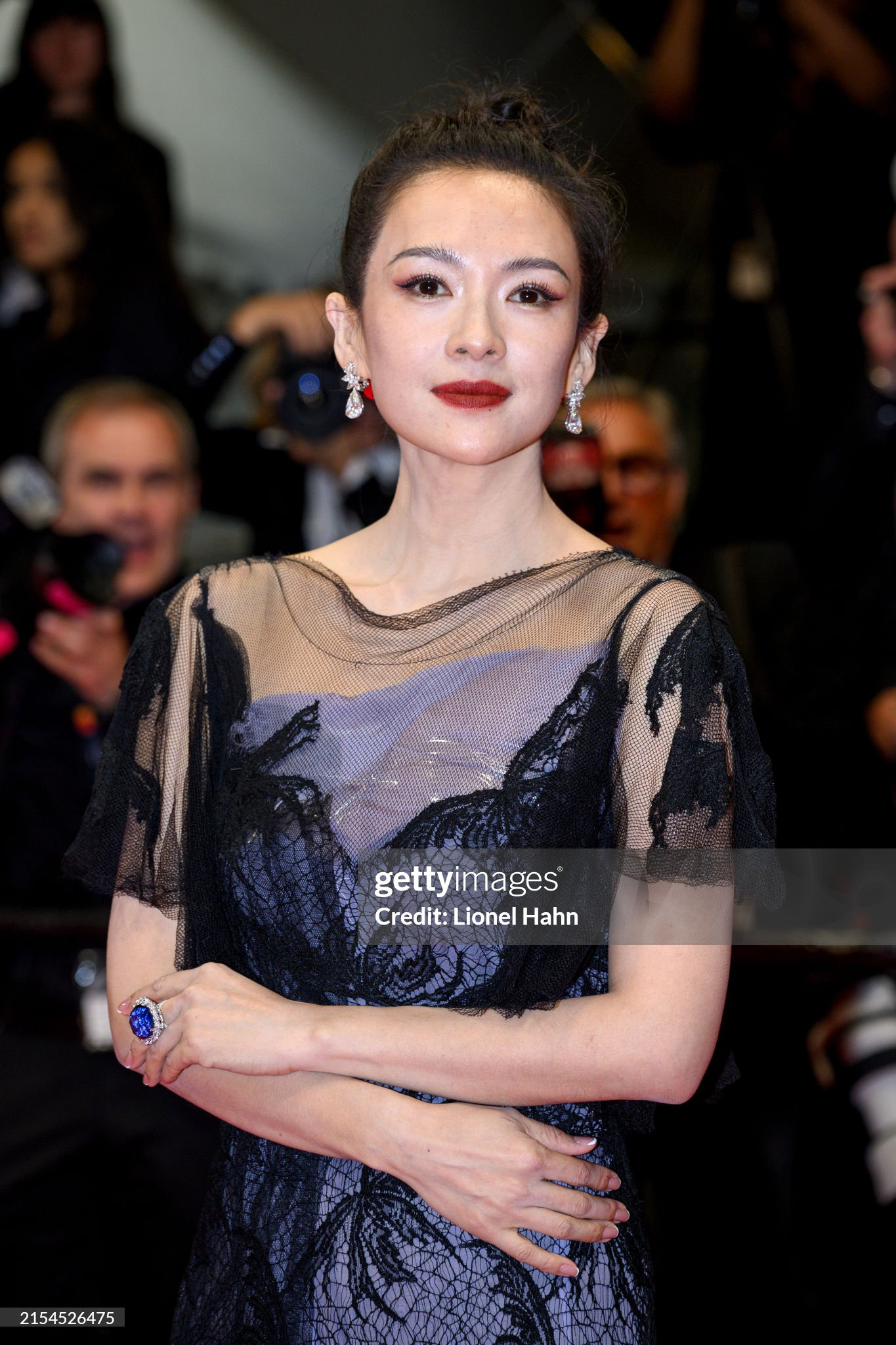 Trái với vẻ ngọt ngào của Dương Mịch, Chương Tử Di khí chất ngút ngàn với tông đen huyền bí trên thảm đỏ. Mỹ nhân 45 tuổi khoe nhan sắc mặn mà trong thiết kế đầm xuyên thấu tông màu tối của Maison Margiela kết hợp kiểu make up son đỏ mận, kẻ mắt sắc bén.