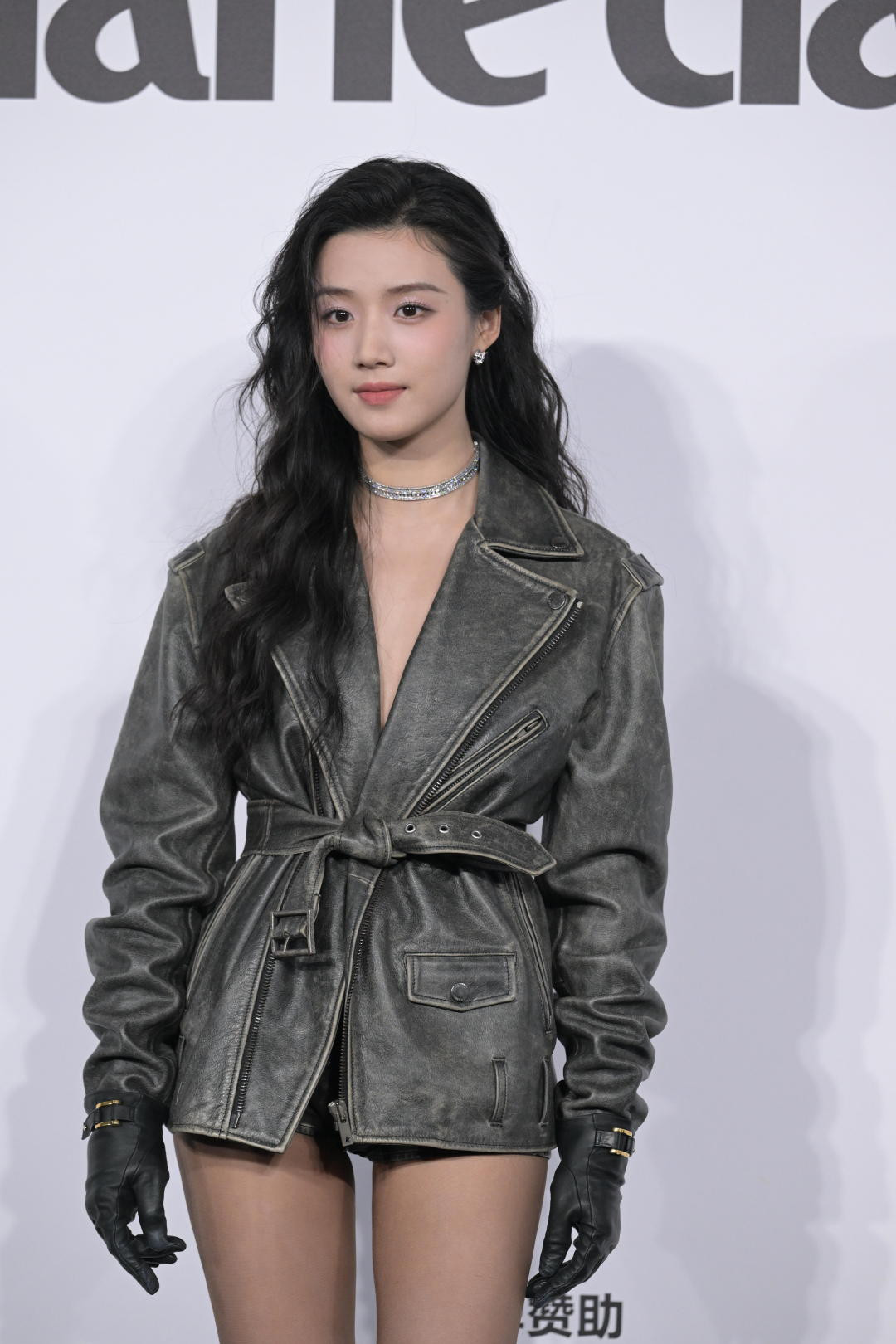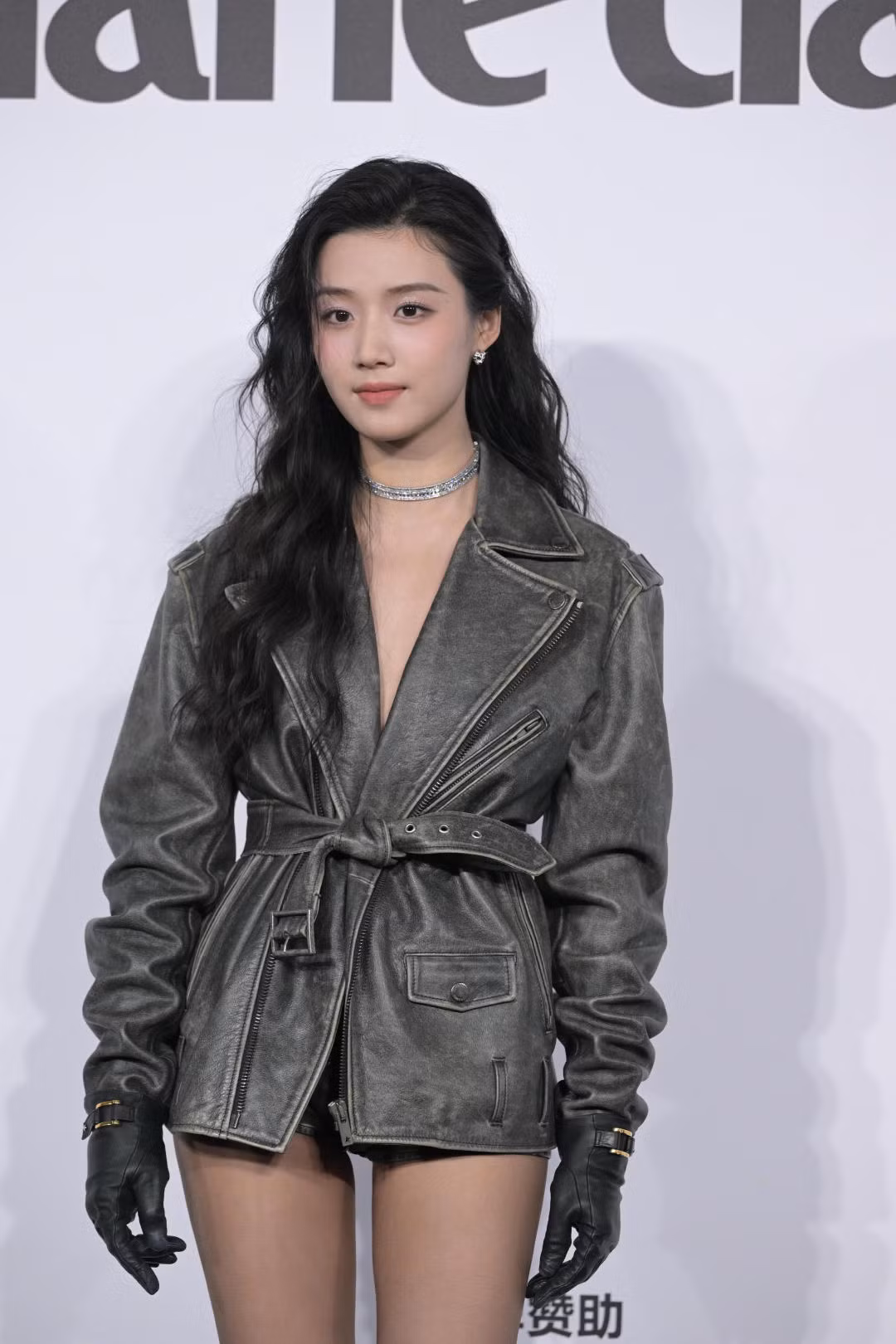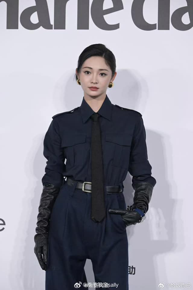 Chu Khiết Quỳnh ghi điểm nhờ tạo hình thảm đỏ mang hơi hướng menswear, với phụ kiện găng tay da dáng dài, kiểu tóc búi thấp tạo điểm nhấn.