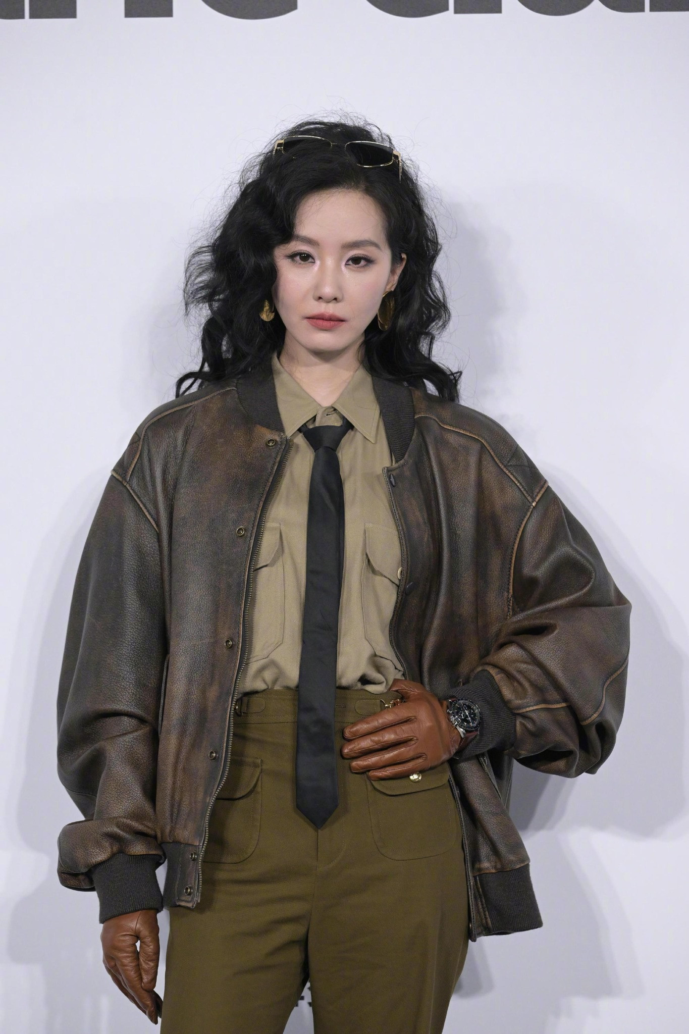 Tân đại sứ toàn cầu Celine - Lưu Thi Thi lựa chọn trang phục tông màu xanh rêu, nâu cho sự kiện. Kiểu tóc xoăn hippie cùng trang phục gợi nhớ tới hình ảnh nữ phi công.