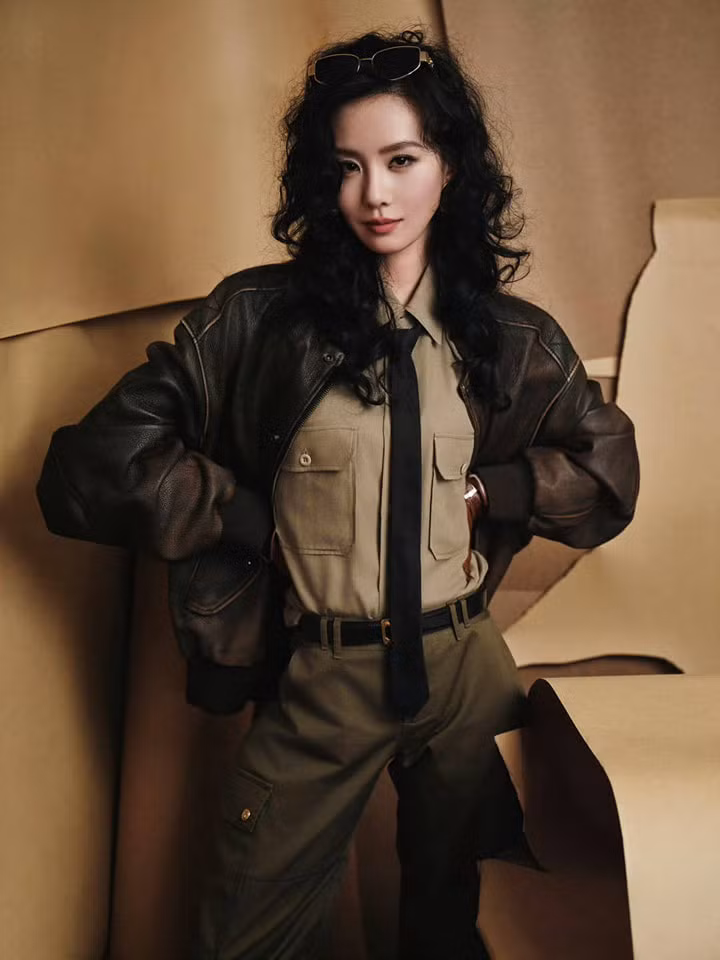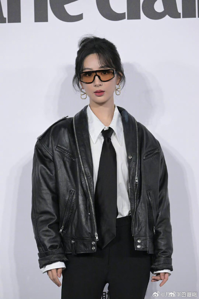 Dương Mịch đẹp cuốn hút nhờ lối trang điểm sắc sảo. Nữ diễn viên diện thiết kế đầm, áo khoác da nằm trong BTS Thu Đông 2021 của Yanina, tạo điểm nhấn với tất chân đính nơ quyến rũ.