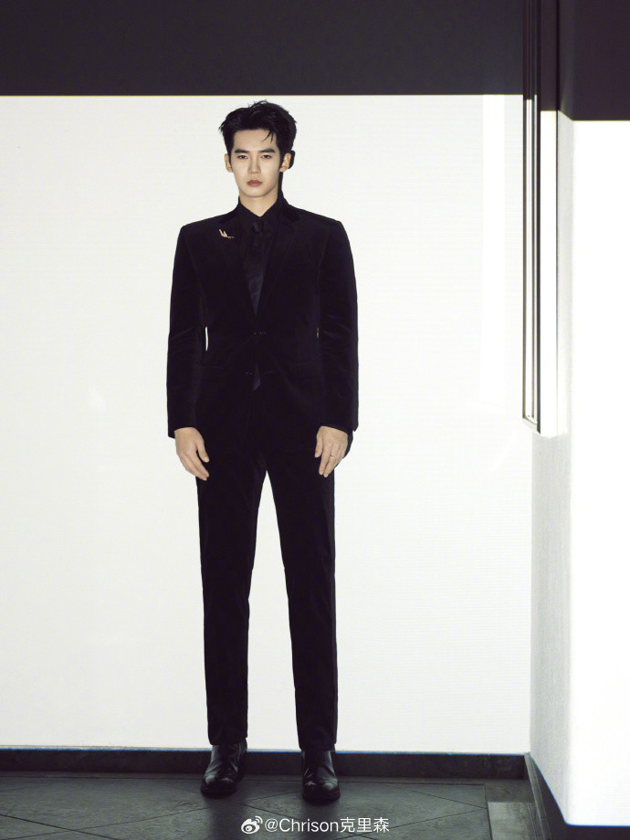 Vu Thích cũng lăng xê thiết kế âu phục từ nhà mốt Dior. Bộ suit đen nhung được kết hợp với trâm cài lúa mì của Chaumet giúp tô điểm cho tạo hình quý ông của mỹ nam Phong Thần.