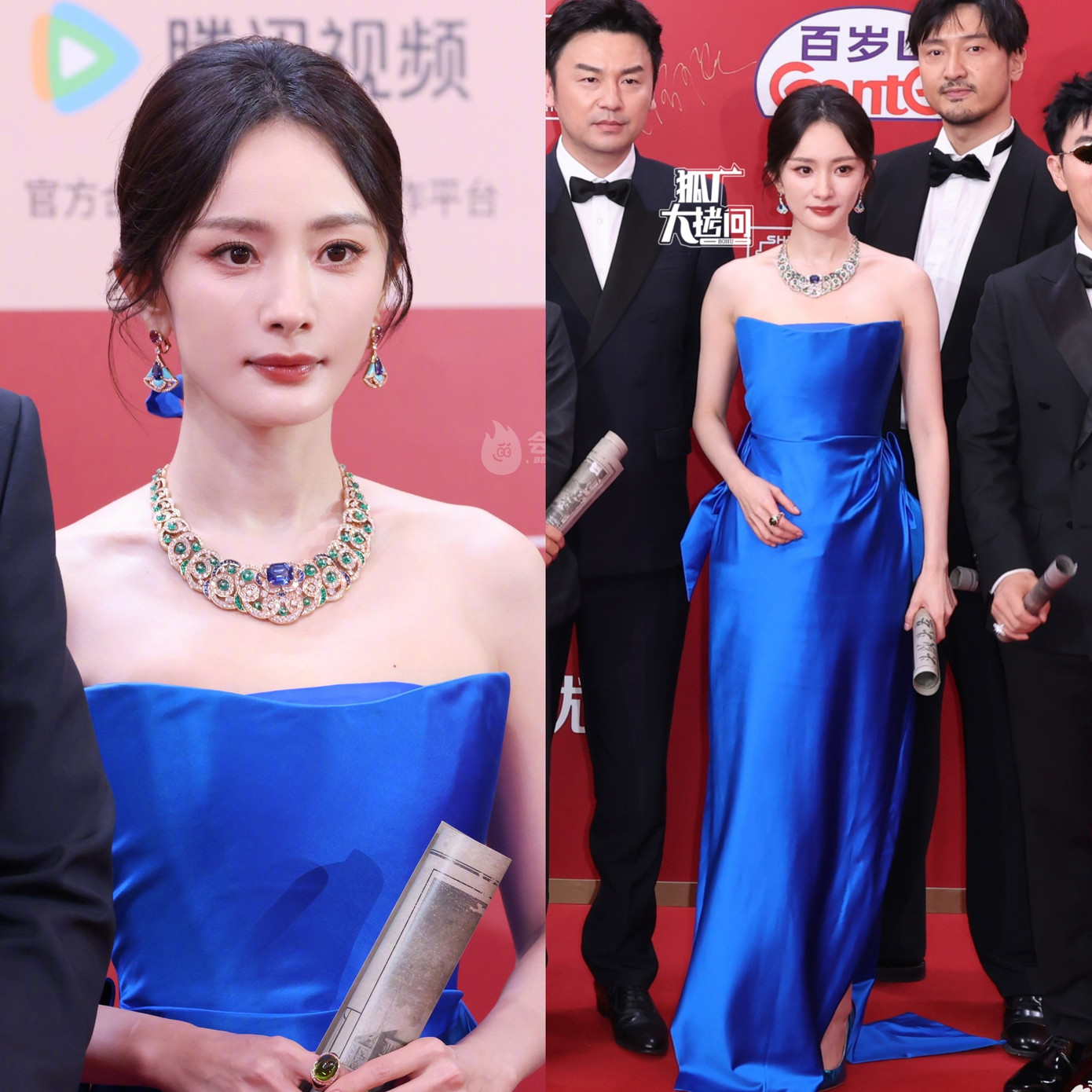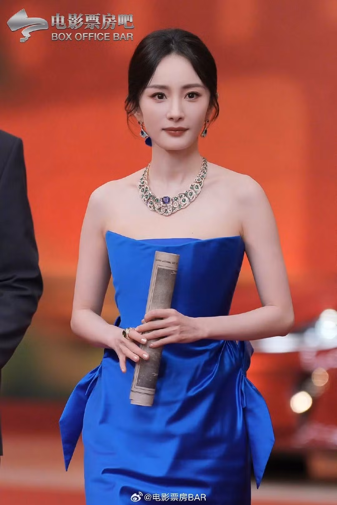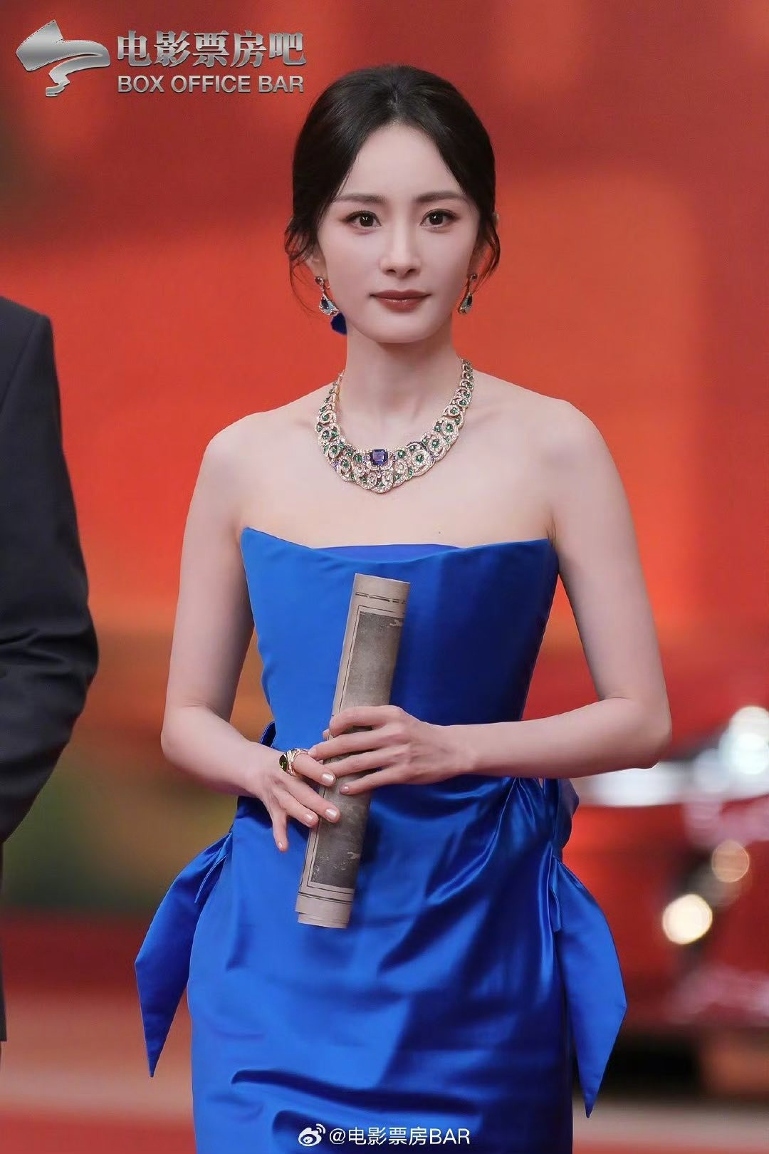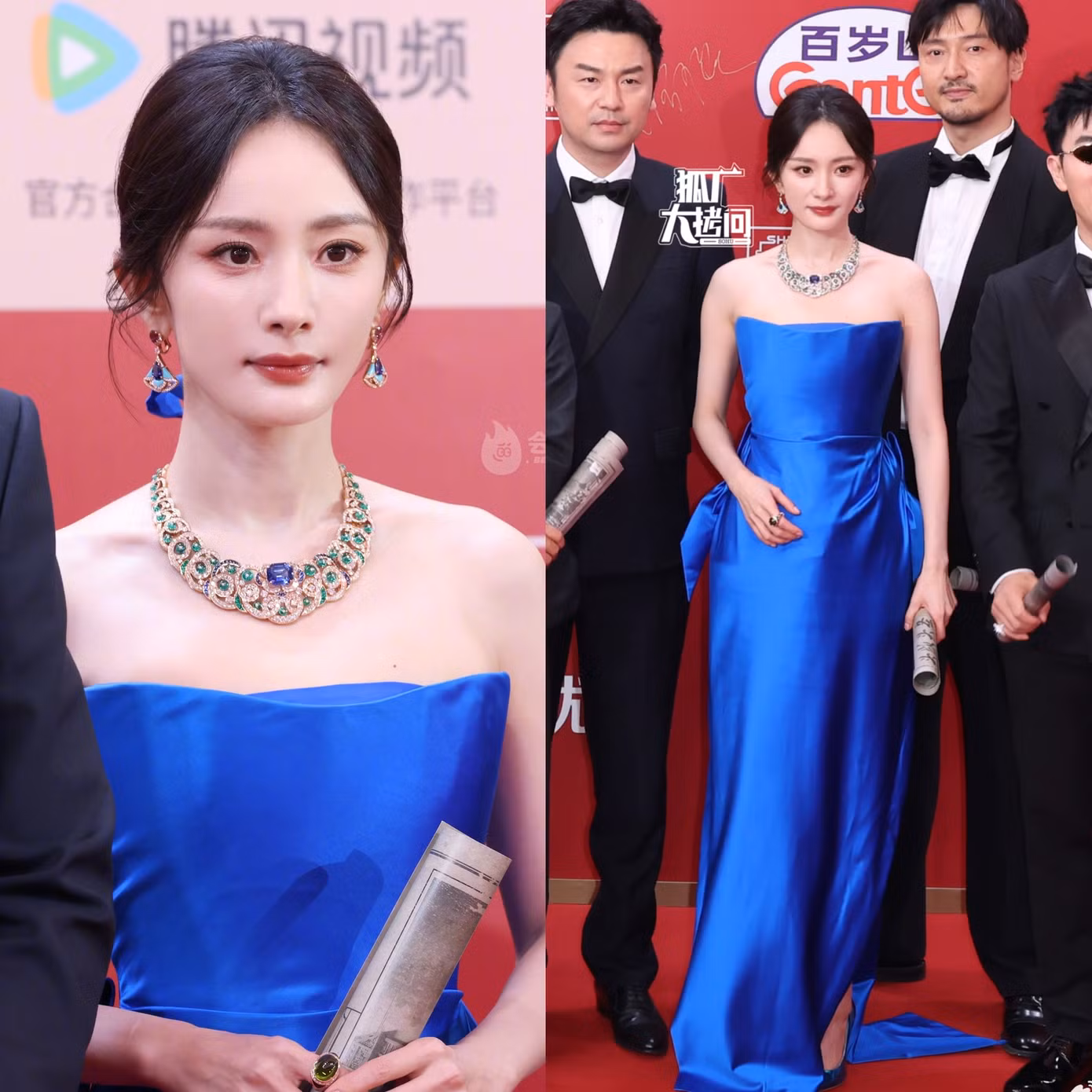 Dương Mịch diện mẫu đầm cúp ngực màu xanh dương, dòng Haute Couture thuộc BST Thu Đông 2024 của nhà mốt Schiaparelli, tôn lên làn da trắng sứ của nữ diễn viên.