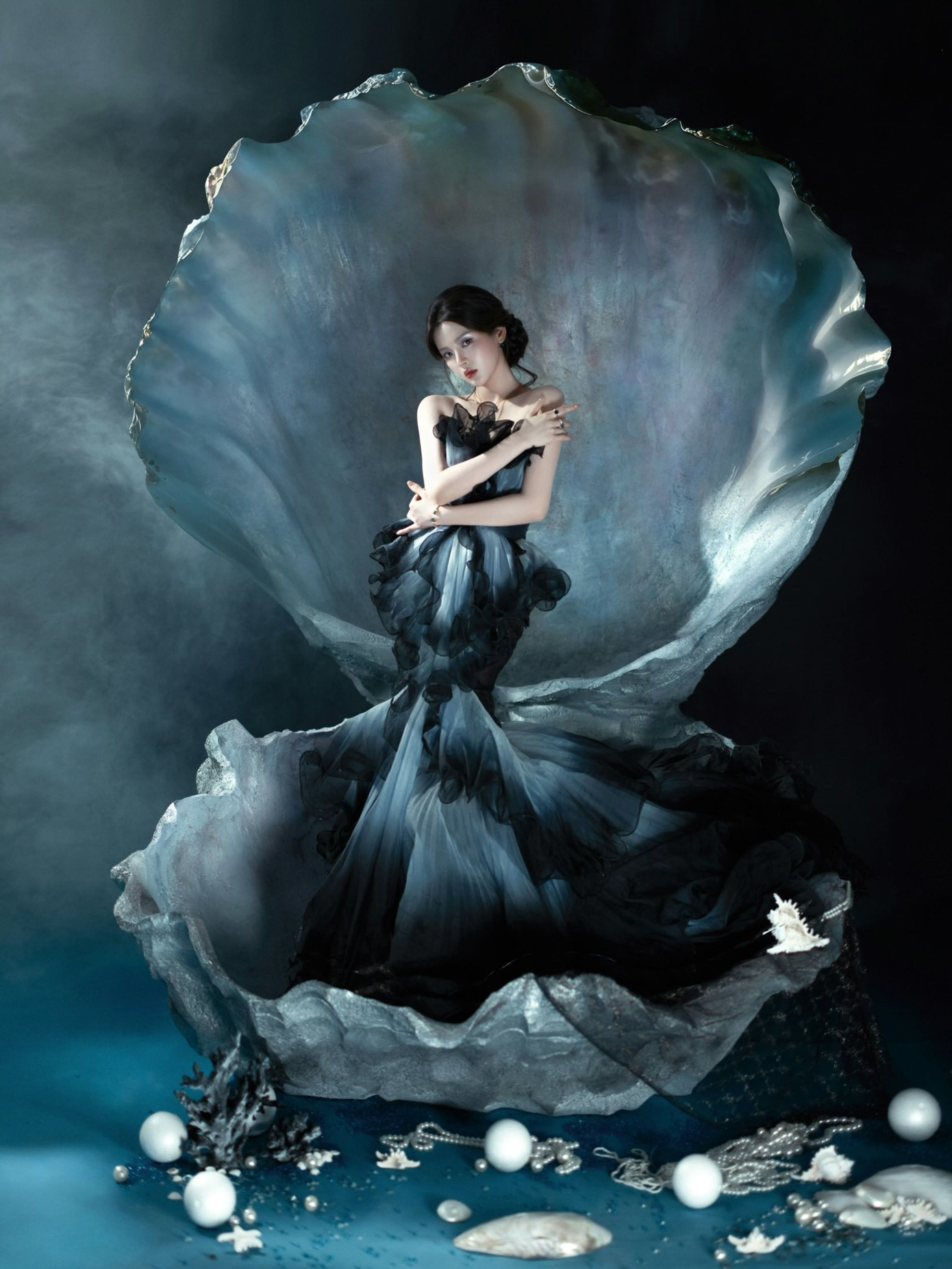 Dương Siêu Việt hóa nàng tiên cá trong mẫu váy ombre của thương hiệu Marchesa, đeo trang sức của Pomellato.