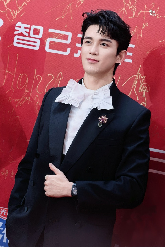 Ngô Lỗi điển trai trong lễ phục của thương hiệu Saint Laurent. Mẫu áo sơ mi có phần cổ bèo nhún, trang sức BVLGARI giúp mỹ nam hóa thân thành "vương tử".