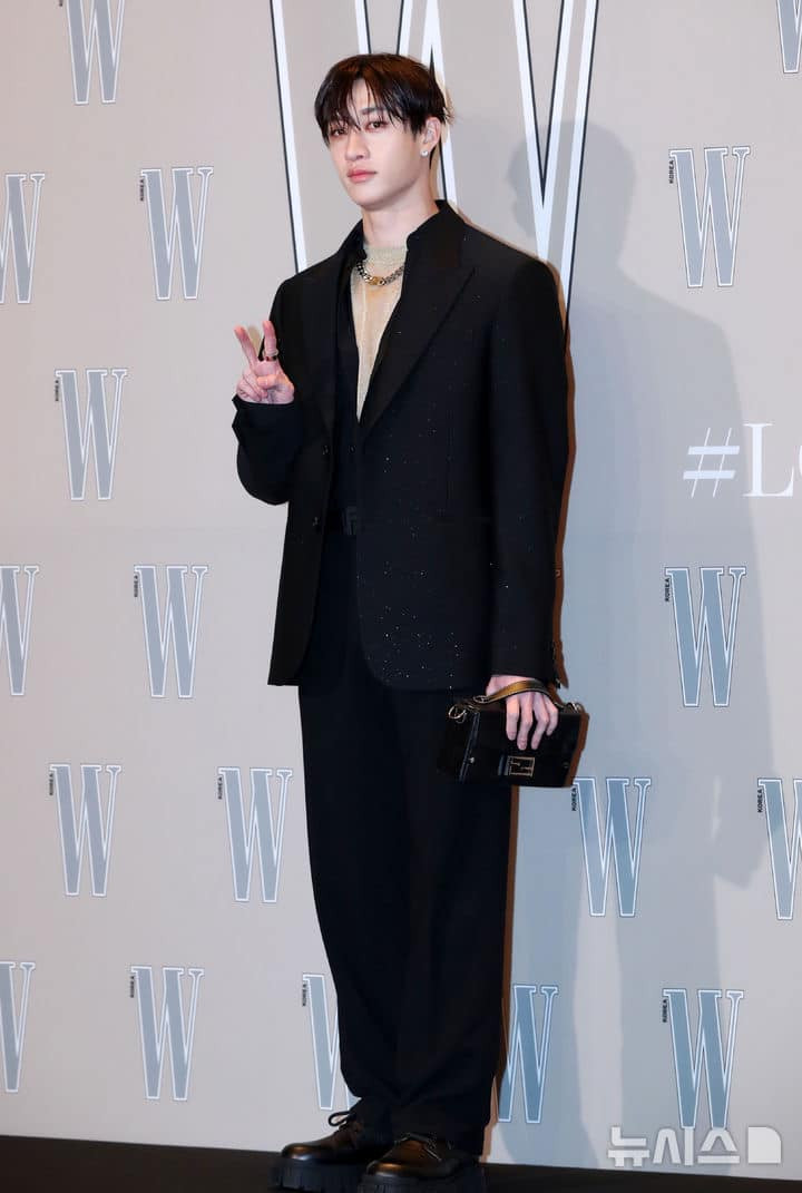 Bang Chan đồng hành cùng nhà mốt Fendi, diện âu phục có phần áo vest đính đá lấp lánh đến từ BST Thu 2024 dành cho nam. I.N xuất hiện trong "cây xám" của Bottega Veneta.