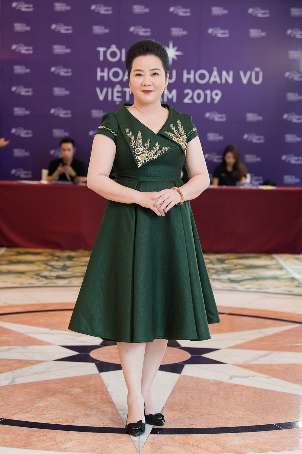 Trưởng Ban giám khảo, bà Võ Thị Xuân Trang thanh lịch với váy xanh.