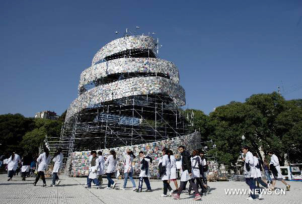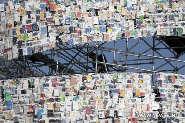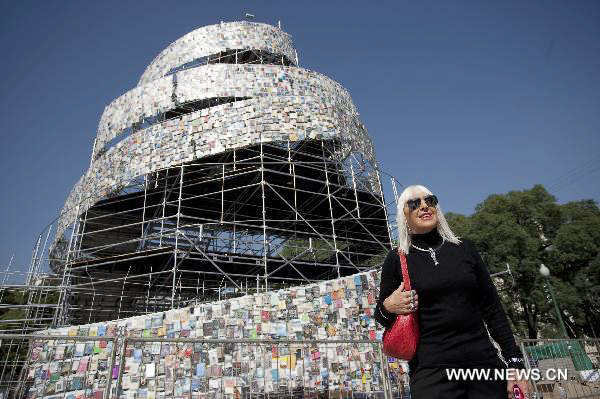 TPO - Nghệ sĩ người Argentina Marta Minujin đã xây một tháp Babel khổng lồ từ hàng ngàn cuốn sách bằng các thứ tiếng khác nhau trên thế giới tại quảng trường San Martin ở thành phố Buenos Aires, Argentina.