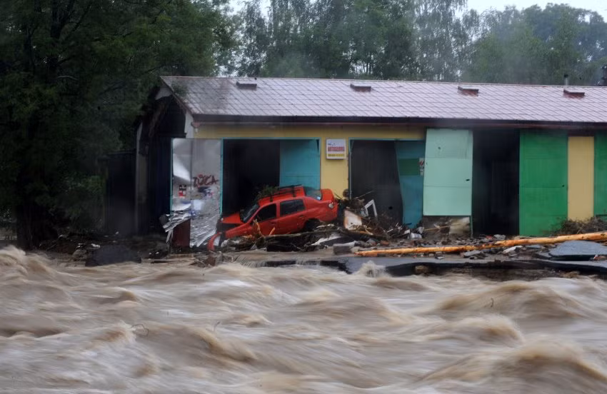 Một chiếc xe bị lũ cuốn trôi ở Chrastava, Czech.
