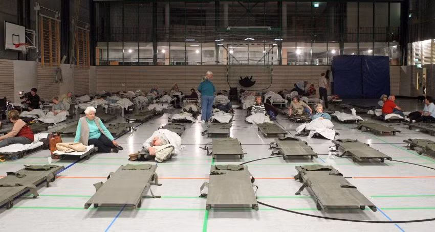 Người dân địa phương phải qua đêm trong những nơi trú ẩn tạm thời như trung tâm thể dục thể thao ở thành phố Gorlitz, Đức.