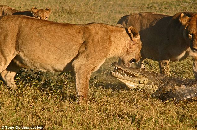 Bầy sư tử nhanh chóng vây quanh con cá sấu này