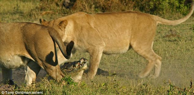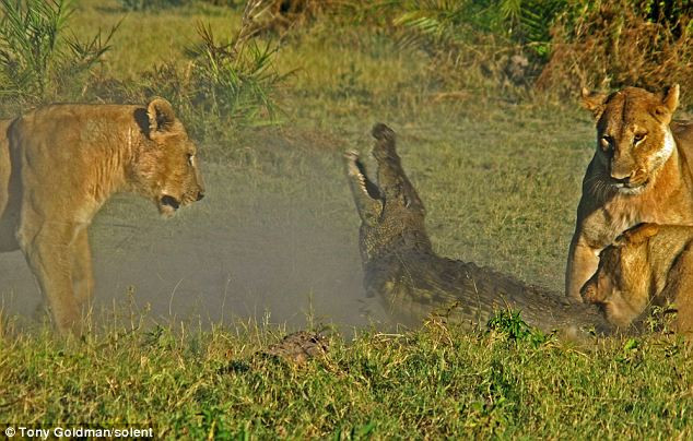 Con cá sấu kêu gào đau đớn khi bị một con sư tử cắn sau đuôi. Lúc này bầy sư tử đã chiếm ưu thế.