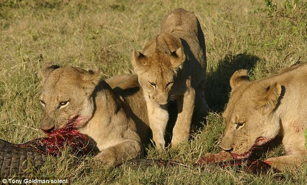 Sư tử con cùng tiến vào ăn thịt con cá sấu sau khi nó đã bị hạ gục.