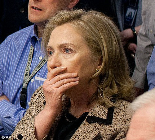Ngoại trưởng Mỹ Hillary Clinton với vẻ mặt đầy căng thẳng, che tay lên miệng kinh hãi trước những cảnh quay tại phòng ngủ Bin Laden.