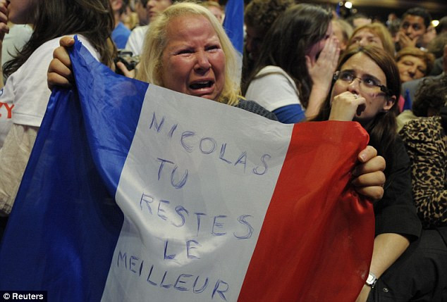 | Một phụ nữ khóc khi biết ông Sarkozy thất bại. |