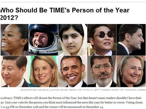 “Cha đẻ” Gangnam Style trở thành ứng cử viên sáng giá cho cuộc bầu chọn thường niên “Nhân vật năm” của tạp chí Time. Đối thủ của Psy là đương kim Tổng thống Mỹ Barack Obama, Kim Jong-un và một số gương mặt nổi trội khác.