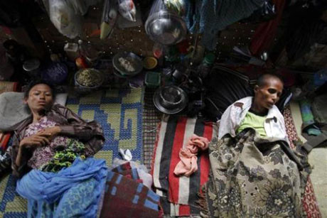 Tại trại tế bần này cũng là cuộc sống của rất nhiều phụ nữ bị lây nhiễm căn bệnh thế kỉ này từ chồng của họ. Trong ảnh là cô Ma Jam (phải) và Eiphyu Khine (trái) dường như đã cạn kiệt sinh lực do căn bệnh mà người chồng quá cố để lại.