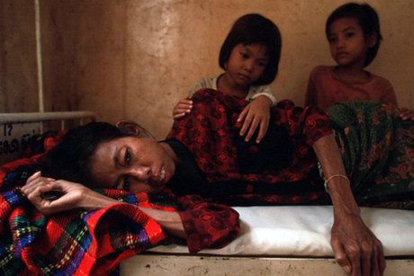 Hai em nhỏ đau xót nhìn mẹ mình đang chết dần chết mòn bởi căn bệnh tử thần tại một căn nhà ở Campuchia.
