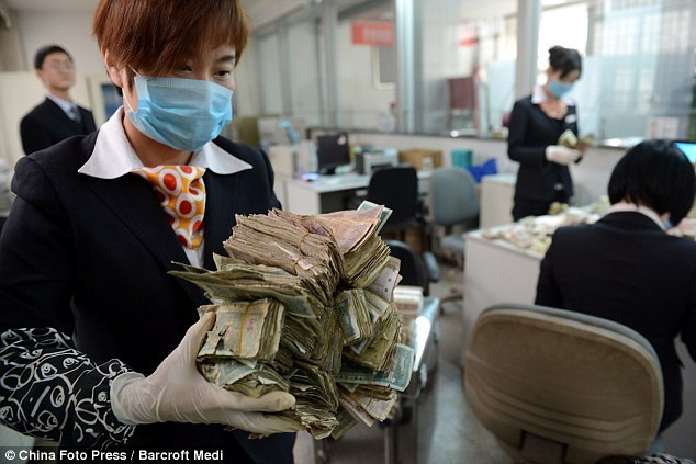 Tuy nhiên, đây lại là hình ảnh những nhân viên ngân hàng đang phân loại và kiểm kê toàn bộ số tiền trị giá 162.000 NDT( tương đương 543 triệu VND) toàn bằng tiền lẻ và cũ. Vị khách hàng đặc biệt họ Cui đã dành dụm được số tiền trên sau 6 tháng tiết kiệm.
