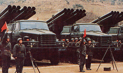 | Pháo dàn phản lực của Triều Tiên tập trận gần biên giới Hàn Quốc. |