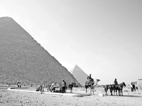 Từ chỗ chúng tôi ở đến cụm Kim Tự Tháp Giza, kỳ quan cuối cùng của thế giới cổ đại còn sót lại trên hành tinh không xa lắm, chúng nằm ở phía Tây của Cairo. Ôtô đưa chúng tôi đi khoảng 30 phút thì tài xế Trung Hiếu nói khẽ như sợ hỏng cổ vật: “Kim Tự Tháp kia rồi!”. Tôi giật mình nhìn theo hướng chỉ tay, mờ mờ xa xa thôi thấy cái chóp. Đến gần một chút, tôi nhìn thấy rõ Kim Tự Tháp hơn. Mấy phút nữa được chạm vào rồi, tôi tự nhủ.