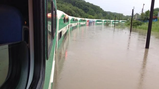 | Tàu hỏa cũng bị ngập trong biển nước. |