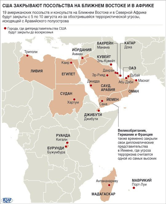 Ngày 6/8 một thông tin mới về lý do đóng cửa các sứ quán Mỹ ở nhiều nước khác nhau đã xuất hiện trên các trang báo. Trước đó Bộ Ngoại giao Mỹ đã thông báo, nhiều cơ quan đại diện của Mỹ sẽ đóng cửa vào ngày 4/8 vì lý do an ninh. Trên các phương tiện truyền thông người ta đưa tin chính vào ngày này Al Qaeda dự định tiến hành khủng bố nhằm vào các nhà ngoại giao Mỹ vì đúng ngày đó những người theo đạo Hồi kỷ niệm Đêm sức mạnh. Tuy nhiên, nếu suy xét kỹ một chút hình như sự kiện này có liên quan tới thời điểm 4/8, chính là ngày sinh của tổng thống Mỹ Obama.