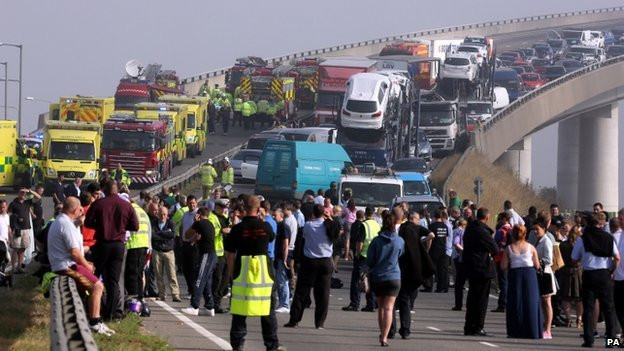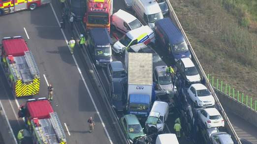 Những hình ảnh về vụ tai nạn 130 ô tô đâm liên hoàn trên cây cầu ở khu vực Kent, Anh: