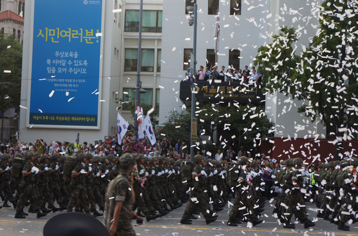 Sau nhiều tiếng chờ đợi giữa tiết trời mùa thu bỗng trở nên oi bức, đã có không người người già bị ngất xỉu. Các lực lượng quân đội bắt đầu phô diễn sức mạnh với cuộc duyệt binh bắt đầu từ Dongdaemun, một trong 2 khu chợ lớn nhất Seoul, qua tòa thị chính, quảng trường Gwanghwamun…trong quãng đường dài 1,5 km.