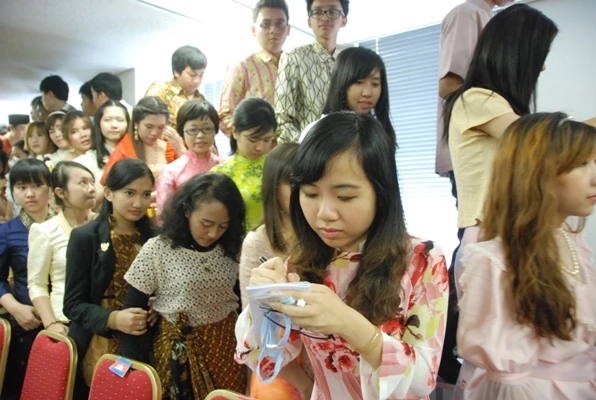 | Các sinh viên Nguyễn Xuân Hương Giang, Lê Minh Phương đoàn Việt Nam ký lưu niệm . |