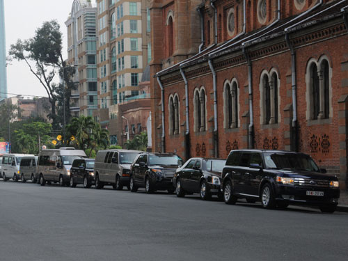 | Đoàn xe đưa ông Kerry đến Nhà thờ Đức Bà. |