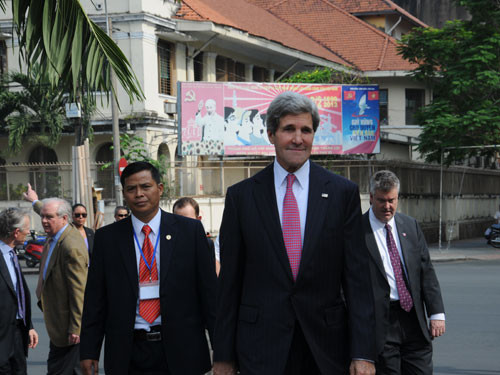 | Ông Kerry đi bộ qua phòng họp báo và không ngừng hỏi han về quang cảnh xung quanh. |