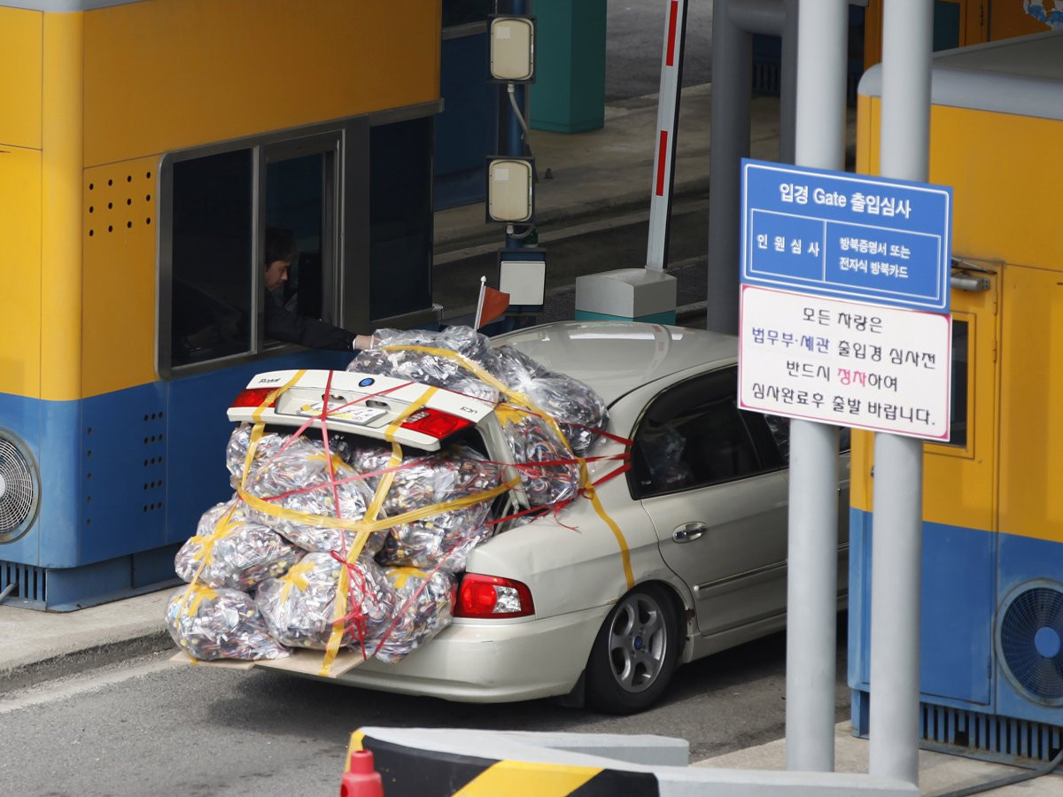 Trong hình là xe của công nhân Hàn Quốc trở về nước sau khi khu công nghiệp chung Kaesong, biểu tượng duy nhất của hợp tác liên Triều bị nước này đóng cửa.