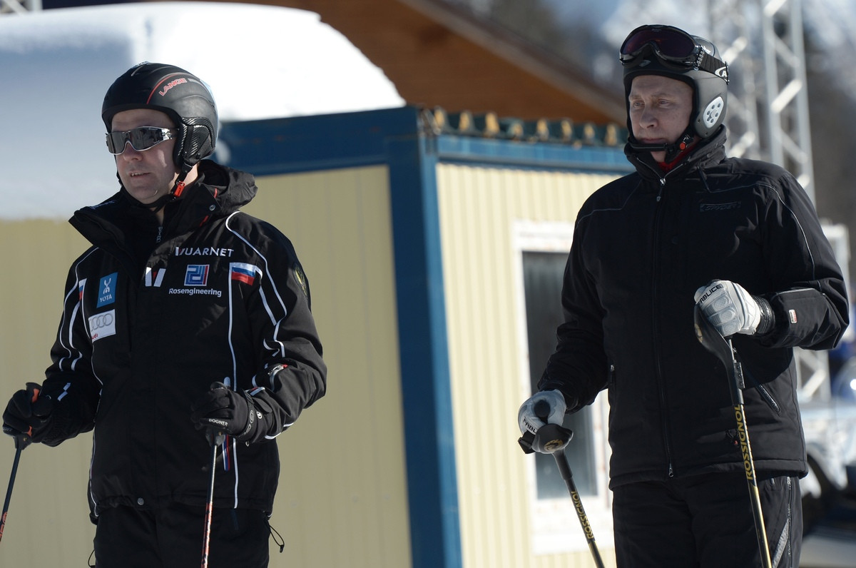 Truyền hình nước Nga đăng tải những hình ảnh ông Putin và Thủ tướng Nga Dmitry Medvedep trượt tuyết cùng nhau tại Krasnaya Polyana, nơi tổ chức tất cả các môn thể thao ngoài trời tại Olympic Sochi.