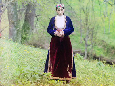 Một người phụ nữ Armenia trong trang phục truyền thống đứng tạo dáng cho Prokudin-Gorskii chụp hình ở bìa rừng, gần Artvin (ngày nay là Thổ Nhĩ Kỳ) trong năm 1910.