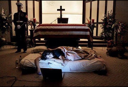 Bức ảnh được chụp vào đêm trước khi chôn cất James Cather, một lính thủy đánh bộ của Mỹ bị thiệt mạng tại Iraq. Vợ của anh, Katherine Cathey đã từ chối rời xa quan tài trong đêm này và muốn được nằm cạnh chồng mình lần cuối cùng.