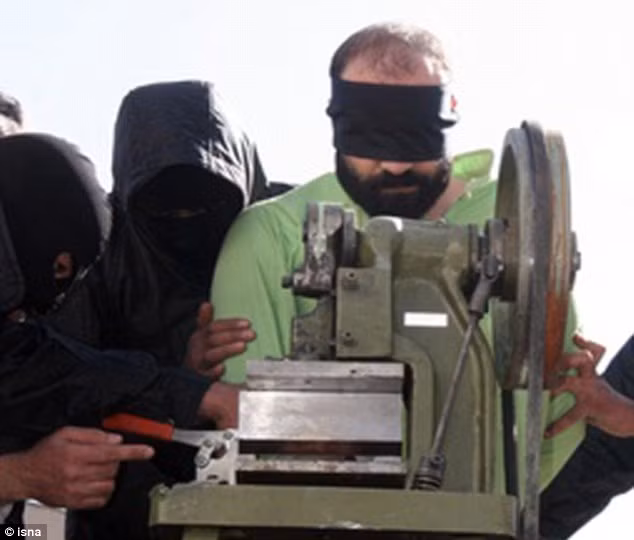 Trong những bức ảnh do một cơ quan tin tức nhà nước Iran đăng tải, một tội phạm bị bịt mắt, do hai người đàn ông trùm kín mặt áp tải đến chiếc máy cưa tay.